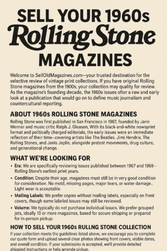 Welcome to SellOldMagazines.com—your trusted destination for the selective review of vintage print collections. If you have original Rolling Stone magazines from the 1960s, your collection may qualify for review. As the magazine’s founding decade, the 1960s issues offer a raw and early look at a publication that would go on to define music journalism and countercultural reporting.