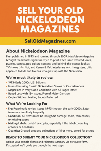 At SellOldMagazines.com, we specialize in the selective review of nostalgic youth publications—including titles like Nickelodeon Magazine that defined an entire era of kids’ entertainment.