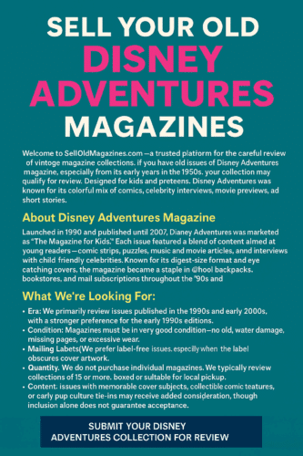 Welcome to SellOldMagazines.com—a trusted platform for the careful review of vintage magazine collections. If you have old issues of Disney Adventures magazine, especially from its early years in the 1990s, your collection may qualify for review. Designed for kids and preteens, Disney Adventures was known for its colorful mix of comics, celebrity interviews, movie previews, and short stories.