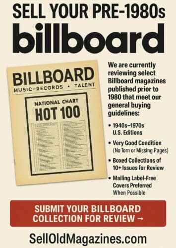 Sell Your Pre-1980s Billboard MagazinesWelcome to SellOldMagazines.com—your trusted source for the selective review of vintage magazine collections. If you have original issues of Billboard magazine from before 1980, your collection may qualify for review. As one of the longest-running publications in American music journalism, early Billboard issues serve as a time capsule for the