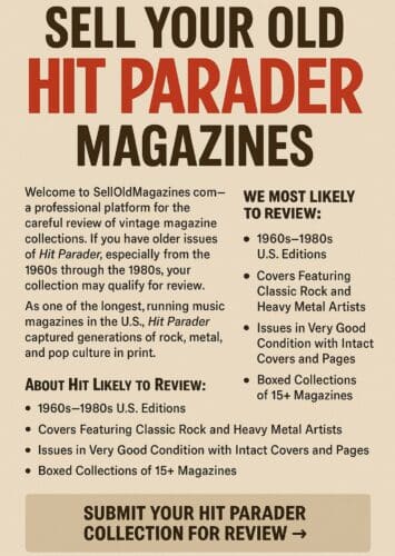 Sell Your Old Hit Parader MagazinesWelcome to SellOldMagazines.com—a professional platform for the careful review of vintage magazine collections. If you have older issues of Hit Parader, especially from the 1960s through the 1980s, your collection may qualify for review. As one of the longest-running music magazines in the U.S., Hit Parader captured generations of