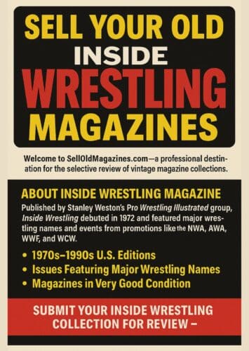 Sell Your Old Inside Wrestling MagazinesWelcome to SellOldMagazines.com—a professional destination for the selective review of vintage magazine collections. If you have older issues of Inside Wrestling, particularly from the 1970s through the 1990s, your collection may qualify for review. As one of the key titles from the golden age of wrestling journalism, Inside Wrestling